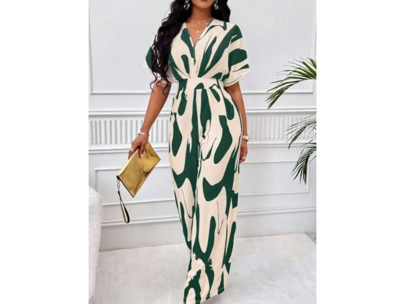 εντυπωσιακή ολόσωμη φόρμα με αφηρημένο print σε πράσινη απόχρωση με χαλαρή γραμμή κρουαζέ ντεκολτέ και ζώνη στη μέση που αγκαλιάζει τη σιλουέτα ιδανική για κομψές καθημερινές και βραδινές εμφανίσεις