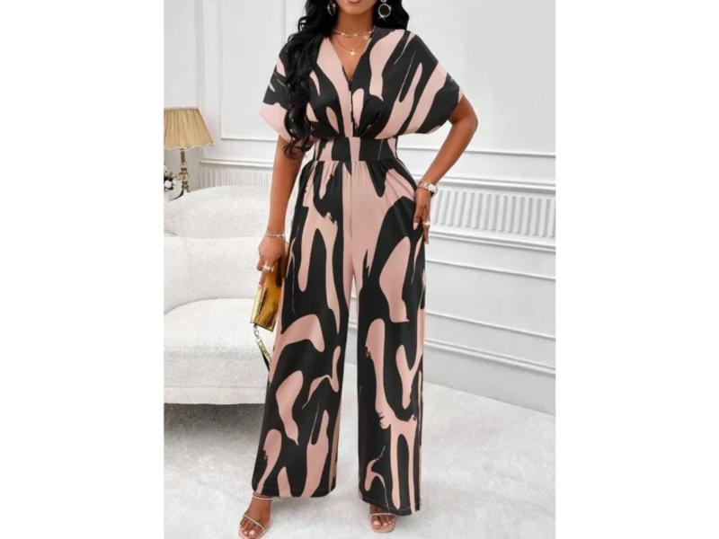 εντυπωσιακή ολόσωμη φόρμα με αφηρημένο print σε nude απόχρωση με χαλαρή γραμμή κρουαζέ ντεκολτέ και ζώνη στη μέση που αγκαλιάζει τη σιλουέτα ιδανική για κομψές καθημερινές και βραδινές εμφανίσεις