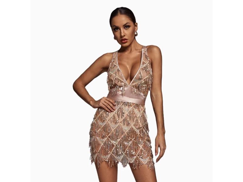 Mini φόρεμα με διάφανες λεπτομέρειες κεντημένο με λαμπερά beads που αγκαλιάζει το σώμα και αναδεικνύει τη σιλουέτα Ιδανικό για βραδινές εμφανίσεις πάρτι και ιδιαίτερες περιστάσεις