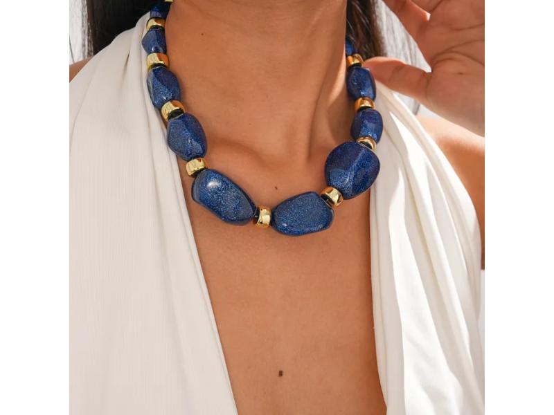 Statement κολιέ με μεγάλες χάντρες σε βαθιά μπλε glitter απόχρωση και λεπτομέρειες μεταλλικού χρυσού Ταιριάζει σε minimal αλλά και glam σύνολα προσφέροντας έντονο χρώμα
