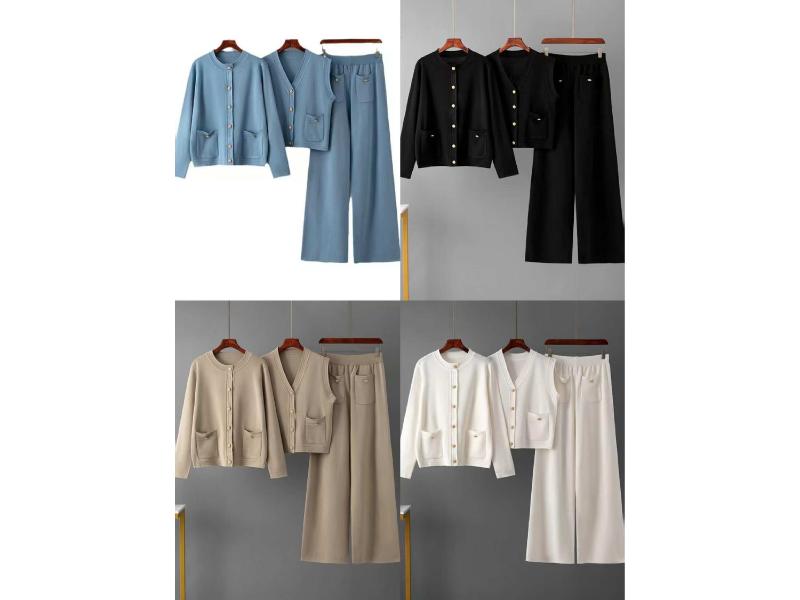 Πλεκτό σετ τριών τεμαχίων με ζακέτα με κουμπιά τοπ και παντελόνι σε ίσια γραμμή που προσφέρει άνεση κομψότητα και καθημερινό elegant στυλ