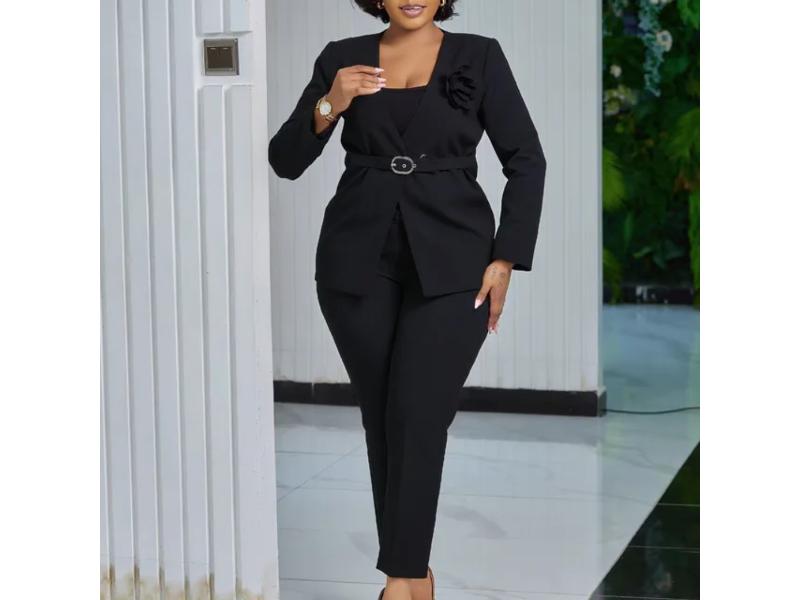 Κομψό σετ δύο τεμαχίων με structured σακάκι με ζώνη στη μέση και διακοσμητικό λουλούδι και ίσια ψηλόμεση παντελόνα Αγκαλιάζει τη σιλουέτα και χαρίζει δυναμικό και θηλυκό αποτέλεσμα Ιδανικό για επίσημες εμφανίσεις και βραδινές εξόδους
