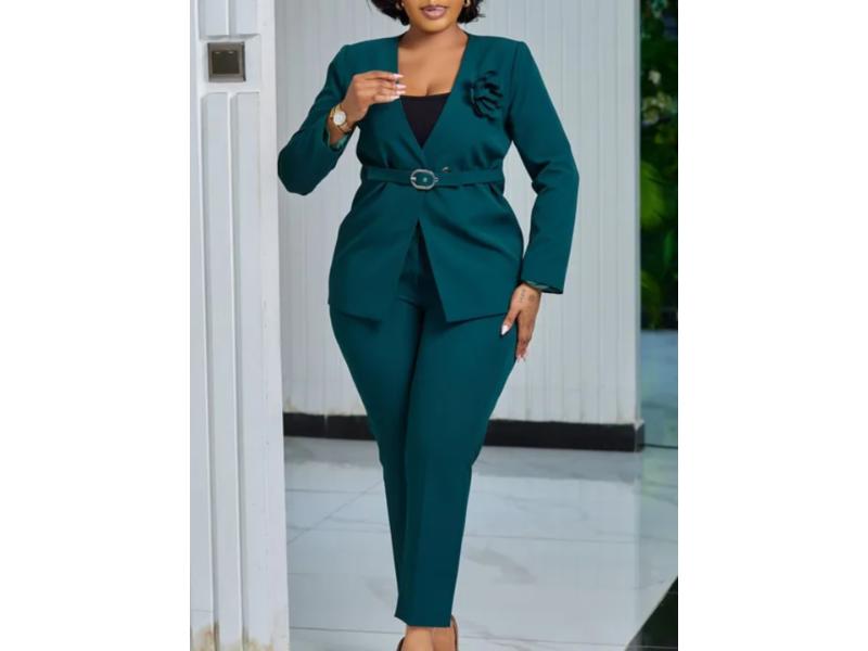 Σετ Κομψό Σακάκι Με Ζώνη Και Παντελόνα Σμαραγδί