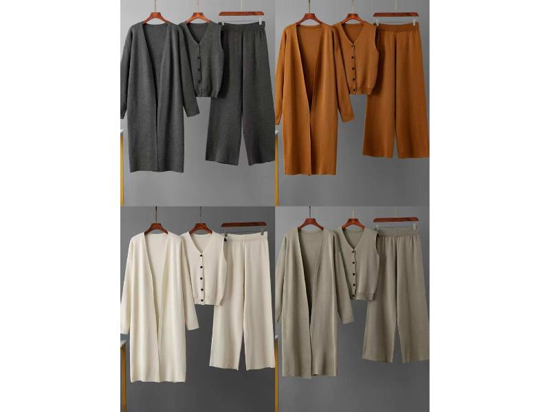 Πλεκτό σετ τριών τεμαχίων με μακριά ζακέτα αμάνικο τοπ με κουμπιά και άνετο παντελόνι που προσφέρει κομψή γραμμή άνεση και διαχρονικό elegant στυλ για καθημερινές εμφανίσεις