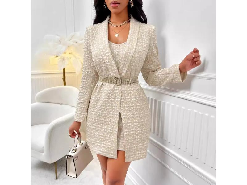 Κομψό σετ σε απαλό κρεμ χρώμα που περιλαμβάνει μίνι φόρεμα με λεπτές τιράντες και ασορτί μακρύ blazer με ανάγλυφη υφή ιδανικό για κομψές και διαχρονικές εμφανίσεις με διακριτική πολυτέλεια