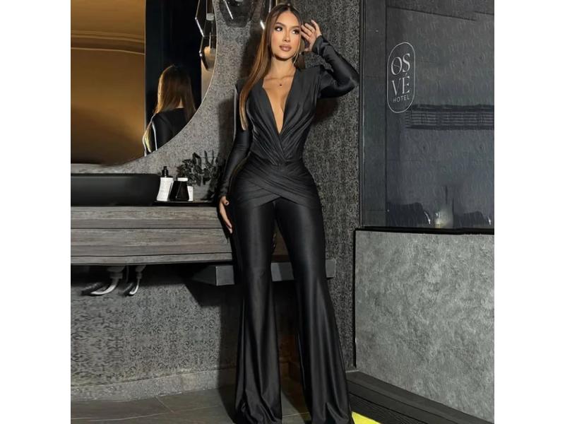 Ολόσωμη φόρμα με εντυπωσιακό βαθύ V ντεκολτέ και ντραπέ λεπτομέρειες που αγκαλιάζουν τη μέση Δημιουργεί σαγηνευτική σιλουέτα με μοντέρνο flare τελείωμα στα πόδια για κομψές βραδινές εμφανίσεις