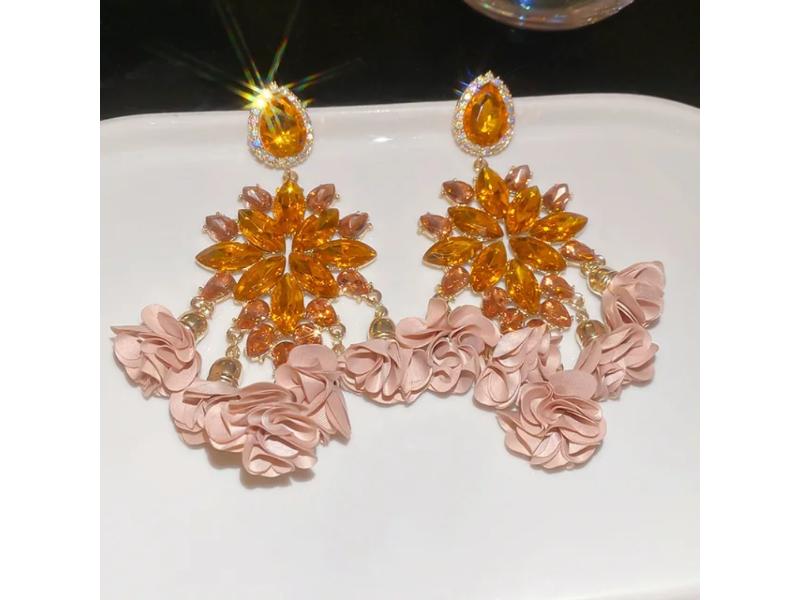 Statement σκουλαρίκια με εντυπωσιακούς κρυστάλλους σε χρυσοκίτρινη λάμψη και κρεμαστά λουλούδια σε nude απόχρωση για glamorous βραδινές εμφανίσεις