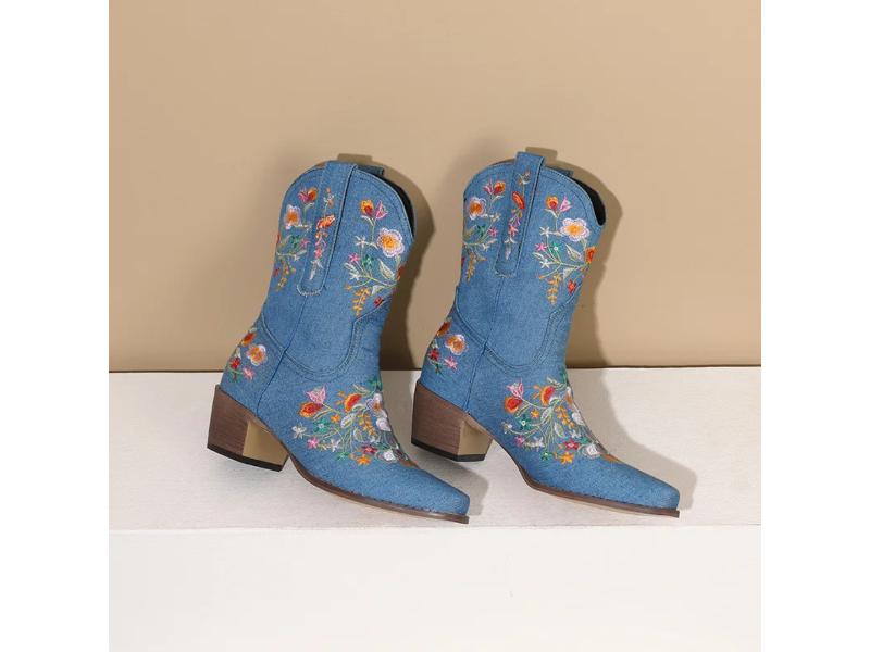 Ψηλή denim μπότα με κεντημένα λουλούδια και σταθερό τακούνι που προσφέρει άνεση και μοναδικό western στυλ Ιδανική για εντυπωσιακές εμφανίσεις με vintage χαρακτήρα