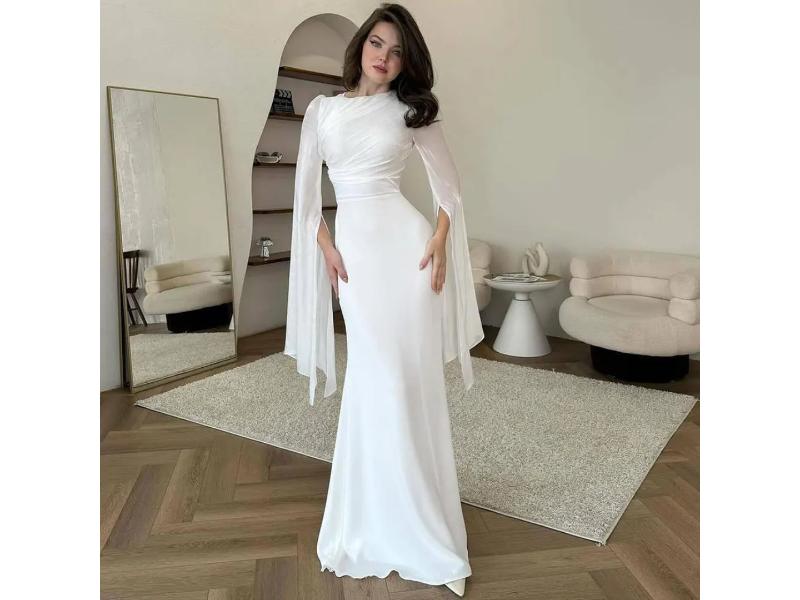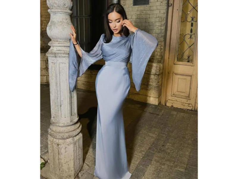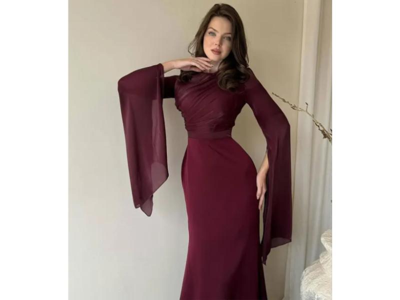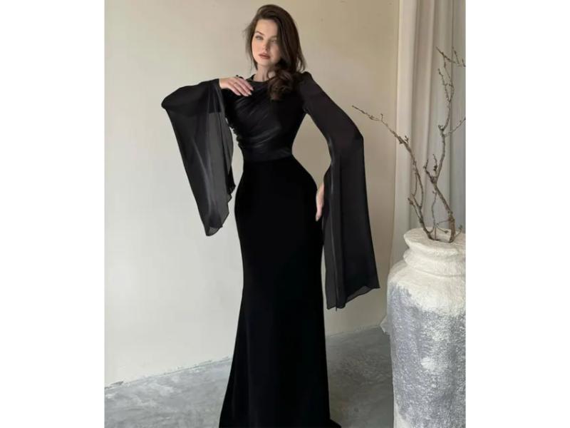 Κομψό maxi φόρεμα με αέρινα μακριά μανίκια και εφαρμοστή μέση που αναδεικνύει τη σιλουέτα με elegant και ρομαντική αισθητική ιδανικό για ιδιαίτερες περιστάσεις.