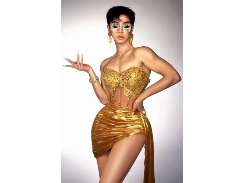 Mini φόρεμα με εφαρμοστό κορσέ διακοσμημένο με χρυσές λεπτομέρειες και drape φούστα που αγκαλιάζει τη σιλουέτα δημιουργώντας εντυπωσιακό glamorous αποτέλεσμα για βραδινές εμφανίσεις