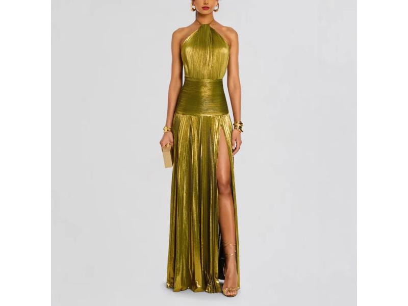 Maxi halter φόρεμα με μεταλλική υφή και κομψό σκίσιμο στο πόδι που αναδεικνύει τη σιλουέτα και χαρίζει εντυπωσιακή glamorous εμφάνιση ιδανική για βραδινές εξόδους και ιδιαίτερες περιστάσεις