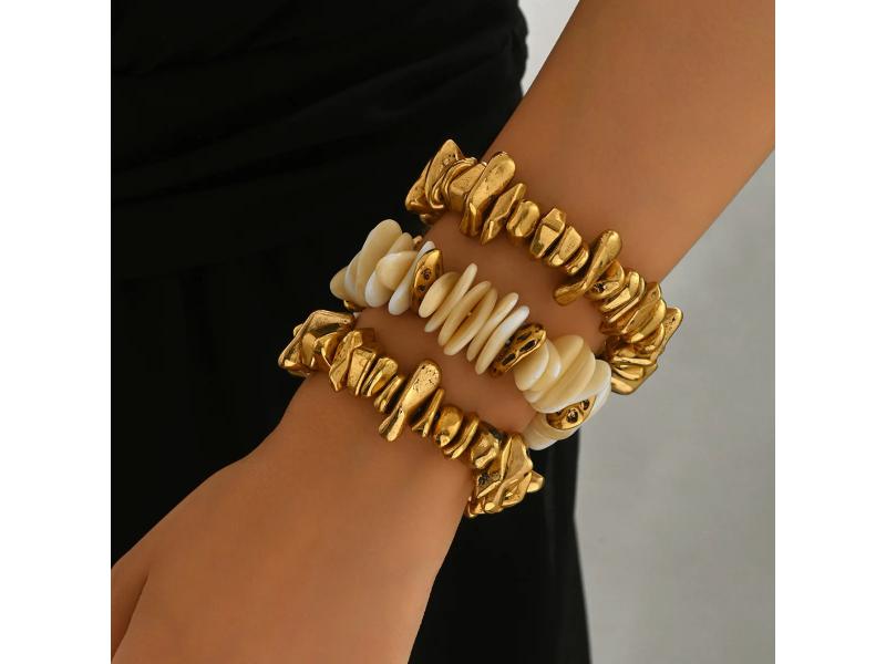 Εντυπωσιακό σετ βραχιολιών με χρυσές chunky λεπτομέρειες και ivory στοιχεία που δημιουργούν ένα statement boho-lux αποτέλεσμα