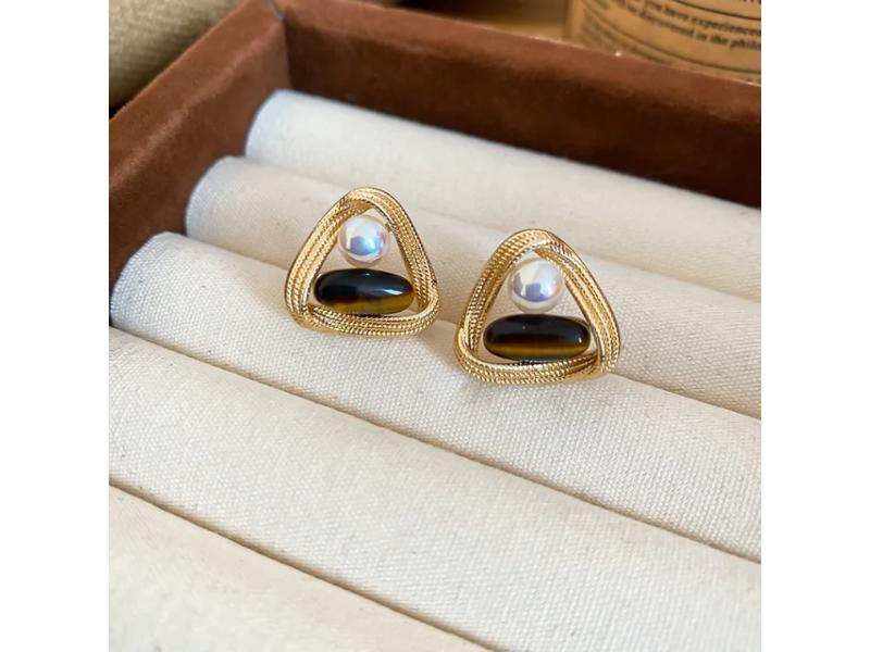 Τριγωνικά Σκουλαρίκια με Πέρλα και Μαύρη Πέτρα