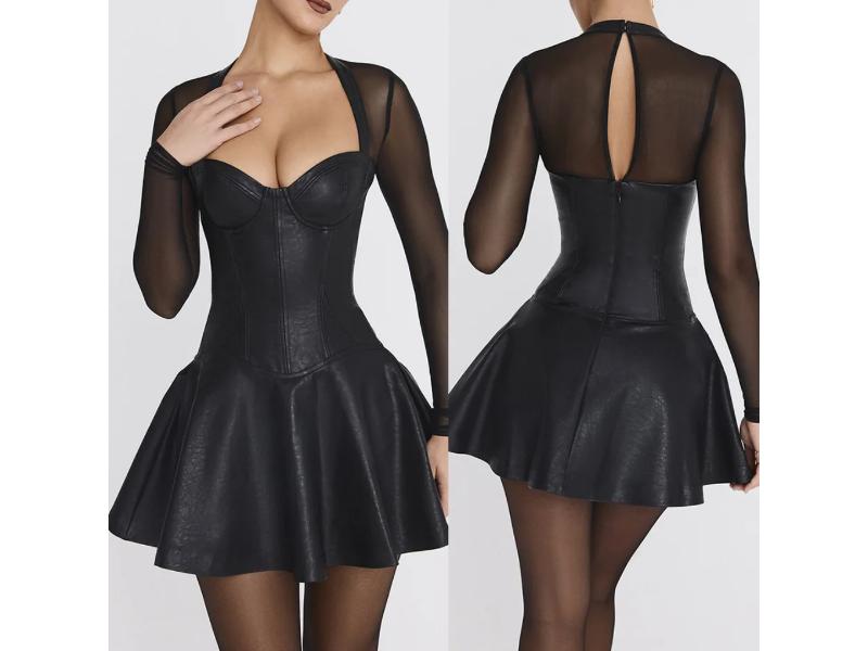 Mini φόρεμα με δερμάτινη όψη κορσέ και διαφανή μανίκια που αγκαλιάζει το σώμα και προσφέρει εκρηκτικό look ιδανικό για βραδινές εξόδους και party εμφανίσεις.