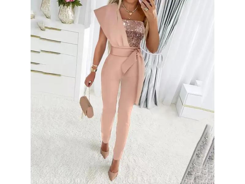 Ολόσωμη Φόρμα One Shoulder Με Παγιέτα Nude