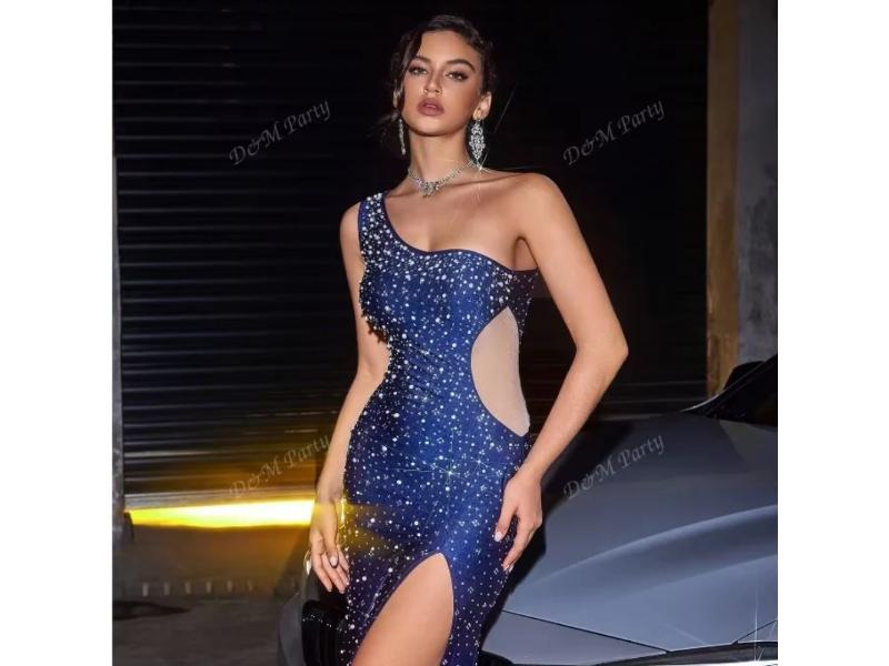 Maxi φόρεμα one shoulder με εφαρμοστή γραμμή διακοσμημένο με strass εντυπωσιακό σκίσιμο στο πόδι και κομψό σχεδιασμό που αναδεικνύει τη σιλουέτα ιδανικό για βραδινές εμφανίσεις και επίσημες εκδηλώσεις