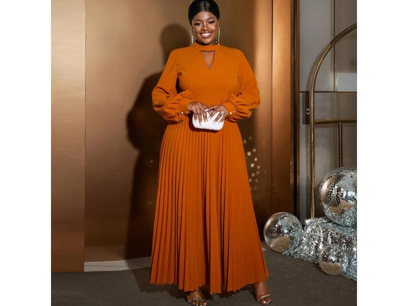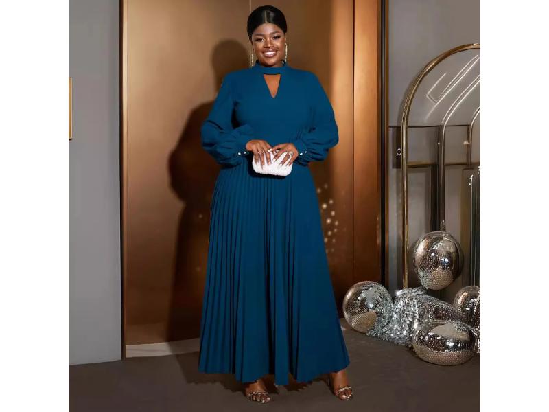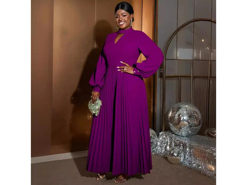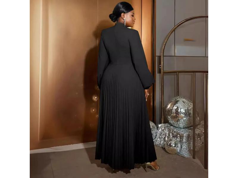 Κομψό maxi φόρεμα με πλισέ φούστα και μακριά balloon μανίκια Διαθέτει εντυπωσιακό άνοιγμα στο λαιμό και άψογη εφαρμογή που κολακεύει κάθε σιλουέτα Ιδανικό για βραδινές περιστάσεις και elegant εμφανίσεις