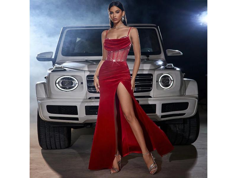 Maxi φόρεμα με εφαρμοστό κορσέ διακοσμημένο με strass λεπτές τιράντες ντραπέ μπούστο και εντυπωσιακό σκίσιμο στο πόδι που αναδεικνύει τη σιλουέτα ιδανικό για glamorous βραδινές εμφανίσεις και special events