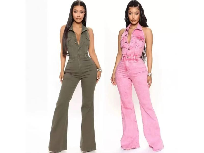 Ολόσωμη Τζιν Φόρμα Αμάνικη Με Καμπάνα Olive