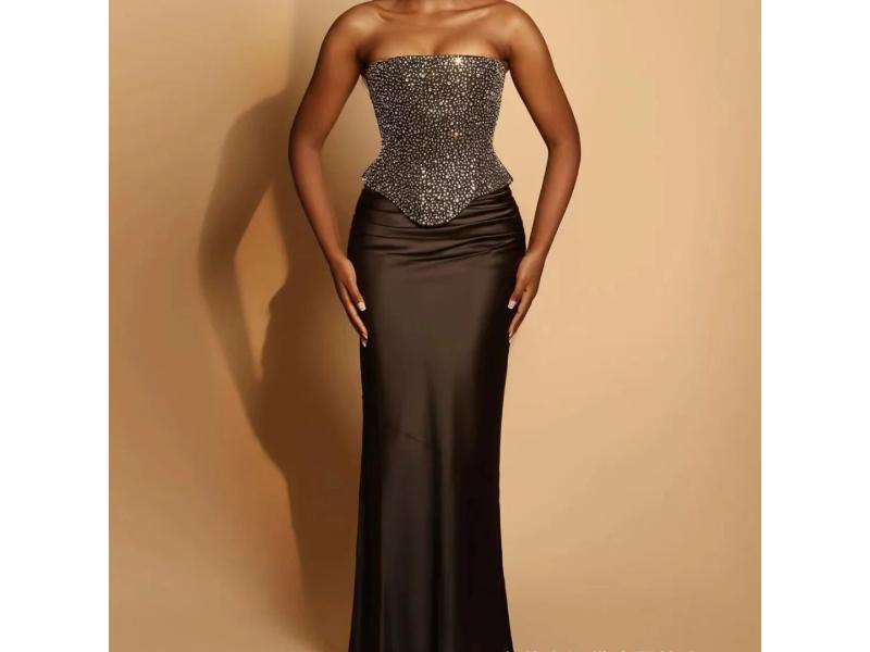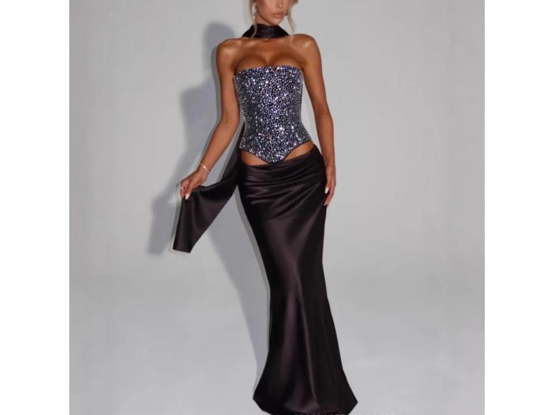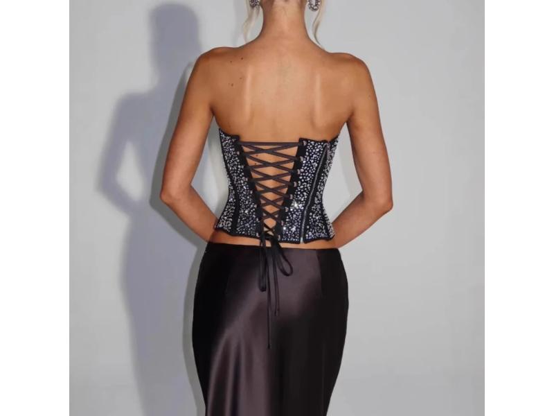 Maxi φόρεμα με στράπλες κορσέ διακοσμημένο με λαμπερά στρας και δέσιμο στην πλάτη Η σατέν φούστα αγκαλιάζει τη σιλουέτα και δημιουργεί αισθησιακό αποτέλεσμα ιδανικό για βραδινές πολυτελείς εμφανίσεις