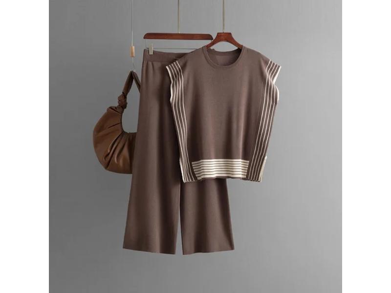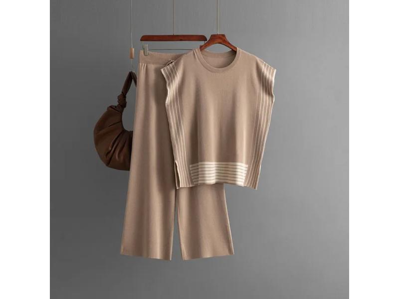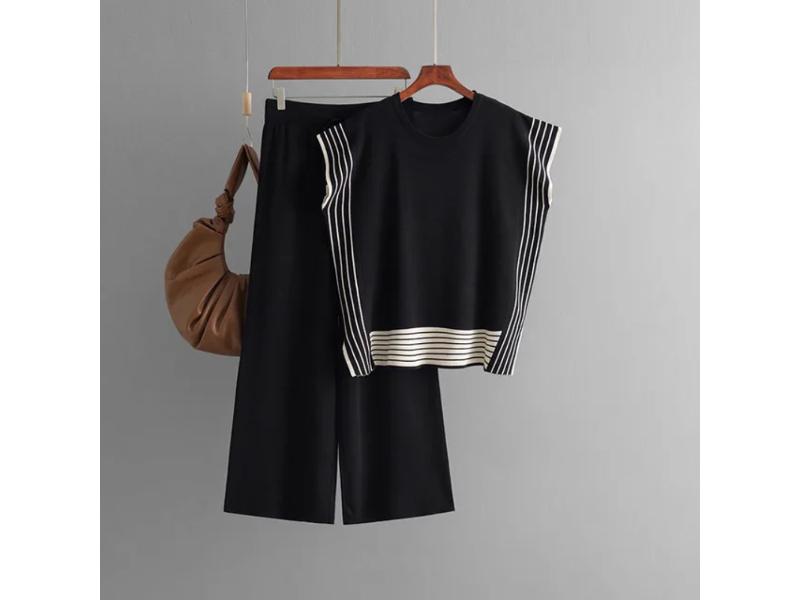 Μοντέρνο πλεκτό σετ με αμάνικο τοπ και παντελόνα σε ίσια γραμμή διακοσμημένο με κομψές ρίγες για minimal chic εμφάνιση που ξεχωρίζει.