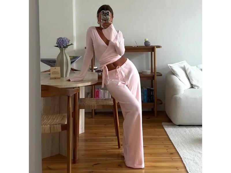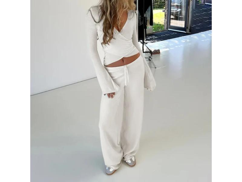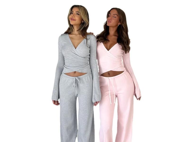 Άνετο και μοντέρνο σετ με μακρυμάνικο τοπ τύπου wrap και παντελόνι με λάστιχο στη μέση Ιδανικό για casual και chic εμφανίσεις συνδυάζοντας στυλ και άνεση σε κάθε στιγμή