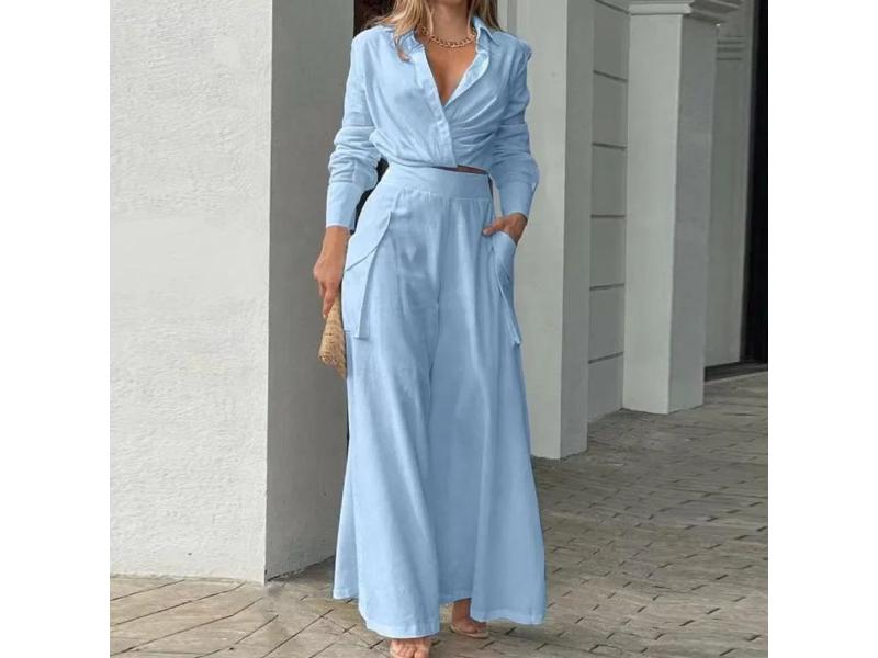 Γυναικείο σετ με κρουαζέ πουκάμισο και ψηλόμεση παντελόνα wide leg σε αέρινη γραμμή που αγκαλιάζει κομψά το σώμα και χαρίζει άνεση και στυλ Ιδανικό για καθημερινές εμφανίσεις αλλά και chic εξόδους με εντυπωσιακή θηλυκή αισθητική