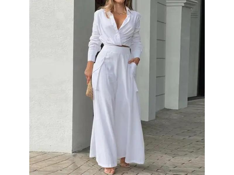 Σετ Πουκάμισο Με Κρουαζέ Δέσιμο Και Παντελόνα Wide Leg White