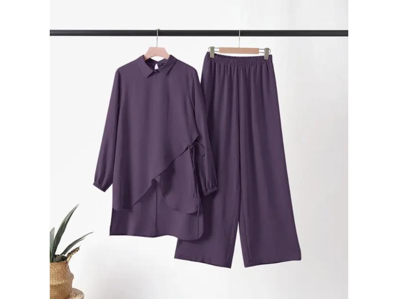 Κομψό σετ με ασύμμετρη πουκαμίσα και φαρδύ παντελόνι σε σκούρο μοβ χρώμα Προσφέρει άνεση και στυλ για κάθε περίσταση