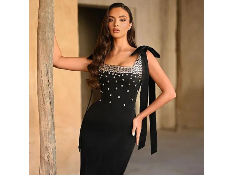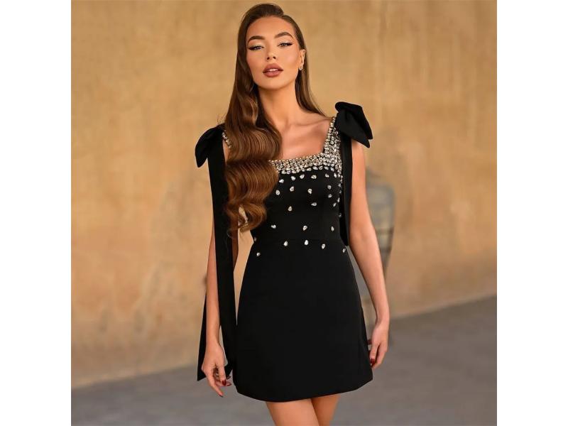 Μαύρο μίνι φόρεμα με τετράγωνη λαιμόκοψη γυάλινες πέτρες στο μπούστο και εντυπωσιακούς φιόγκους στους ώμους. Μία λαμπερή και κομψή επιλογή για glamorous βραδινές εμφανίσεις.