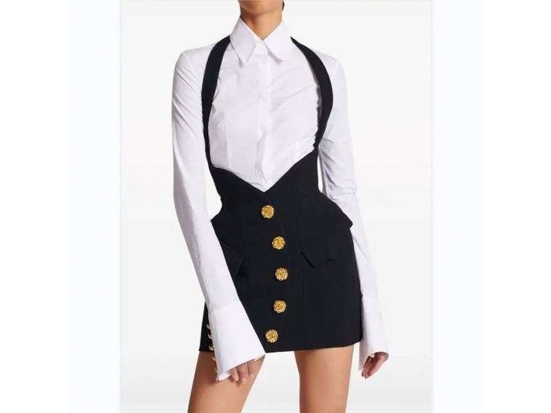 Mini φόρεμα με τιράντες εφαρμοστή γραμμή και διακοσμητικά χρυσά κουμπιά που προσθέτουν πολυτελή πινελιά συνδυάζεται άψογα με λευκό πουκάμισο για sophisticated και statement εμφάνιση