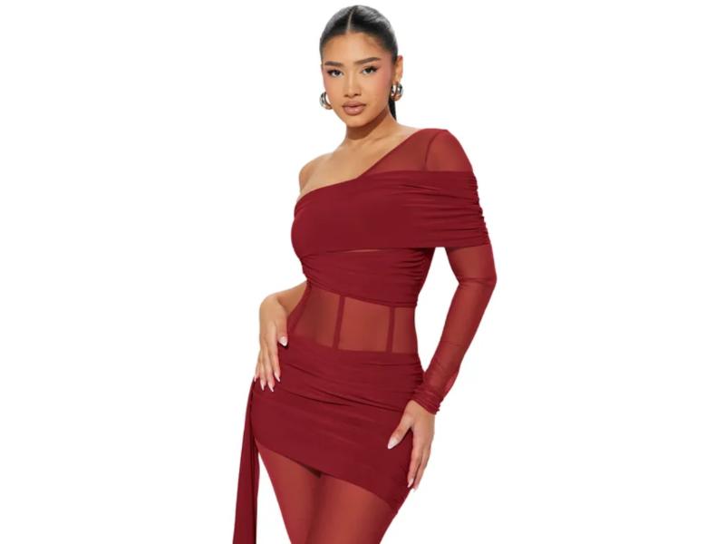 Μοντέρνο σετ σε μπορντό χρώμα με έναν ώμο και διάφανα πάνελ που αναδεικνύουν τη σιλουέτα. Ο συνδυασμός mini φούστας και εφαρμοσμένου τοπ δημιουργεί ένα sexy και elegant αποτέλεσμα ιδανικό για βραδινές εμφανίσεις.
