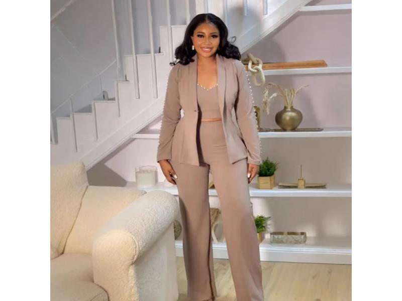 Κλασικό και κομψό σετ που περιλαμβάνει σακάκι με λεπτομέρειες στα μανίκια παντελόνι σε ίσια γραμμή και εσωτερικό τοπ συνδυάζοντας επαγγελματικό ύφος με σύγχρονη θηλυκότητα