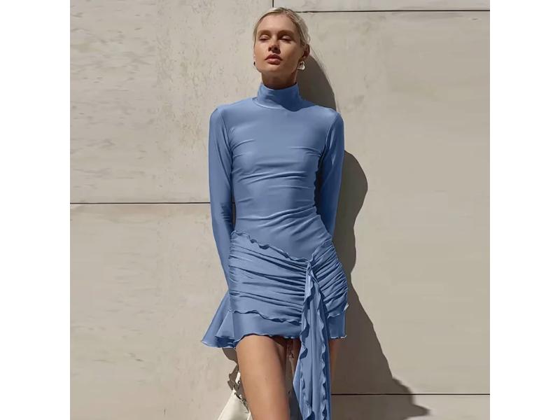 Mini φόρεμα με μακρύ μανίκι και κομψή εφαρμογή που αγκαλιάζει το σώμα. Διαθέτει δραπέ σχέδιο στη φούστα με εντυπωσιακό δέσιμο στο πλάι και μανίκια με καμπύλη τελείωμα για αριστοκρατικό ύφος. Ένα εκλεπτυσμένο κομμάτι ιδανικό για ιδιαίτερες εμφανίσεις.