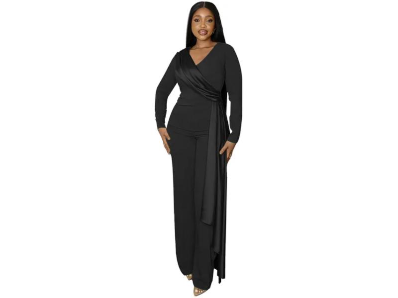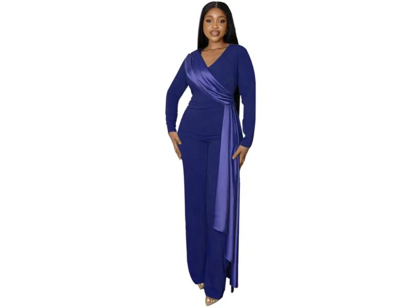 Κομψή ολόσωμη φόρμα με σταυρωτό μπούστο και εντυπωσιακή drapé λεπτομέρεια που αγκαλιάζει τη σιλουέτα προσφέροντας εκλεπτυσμένο και φίνο αποτέλεσμα ιδανική για βραδινές ή επίσημες εμφανίσεις