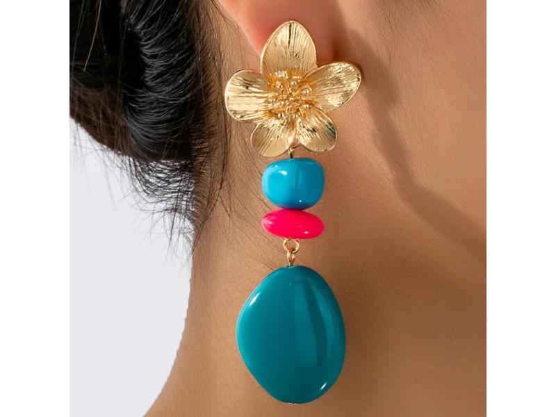 Κρεμαστά σκουλαρίκια με χρυσό μεταλλικό λουλούδι και έντονες πολύχρωμες πέτρες που δημιουργούν statement αντίθεση και δίνουν ζωντάνια σε κάθε εμφάνιση