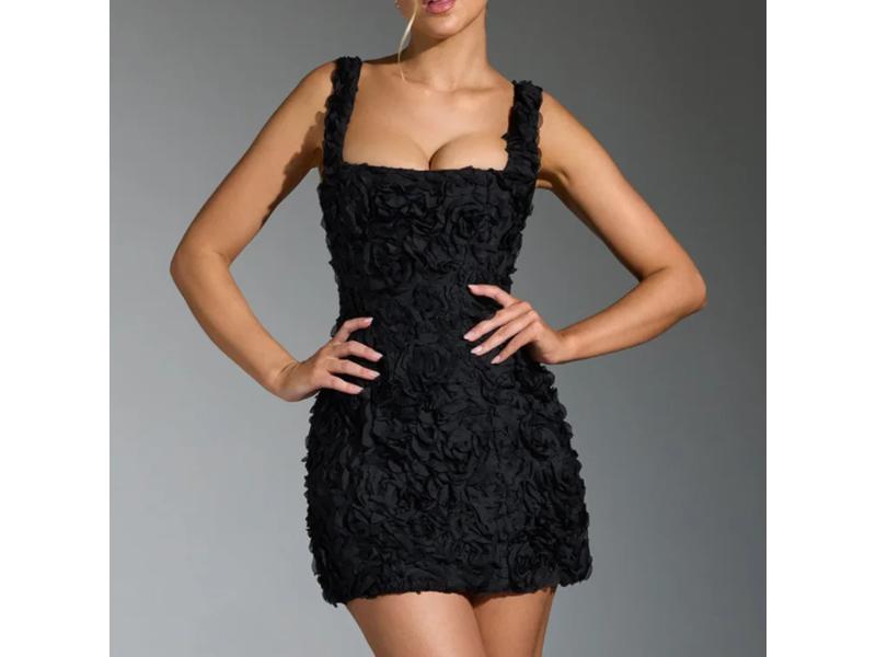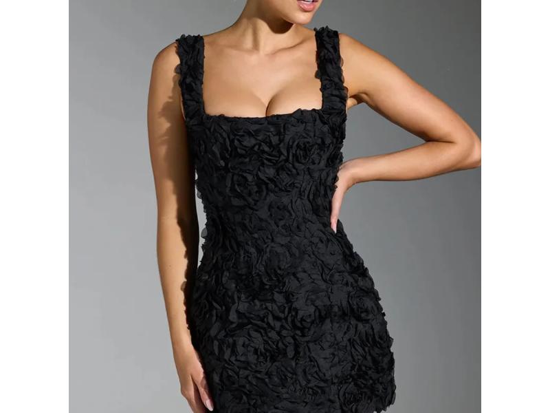 Mini φόρεμα με ανάγλυφα τρισδιάστατα λουλούδια και τετράγωνο ντεκολτέ με εφαρμογή που αγκαλιάζει το σώμα ιδανικό για βραδινές εμφανίσεις και ρομαντικά glam looks