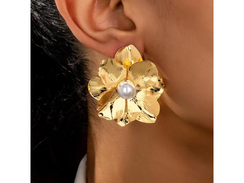 Εντυπωσιακά σκουλαρίκια σε μορφή χρυσού λουλουδιού με κεντρική πέρλα που προσθέτουν κομψότητα και ανάγλυφη λάμψη σε κάθε εμφάνιση