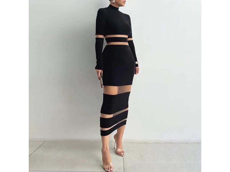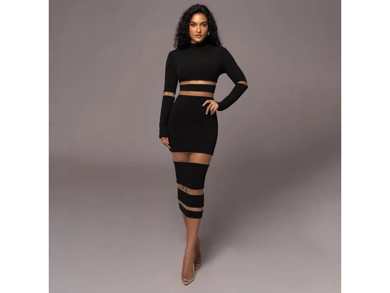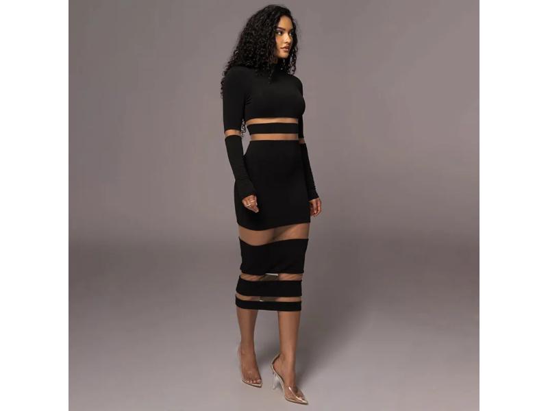 Εντυπωσιακό midi φόρεμα με εφαρμοστή γραμμή και στρατηγικά τοποθετημένες διαφάνειες που τονίζουν τη σιλουέτα Διαθέτει μακριά μανίκια και ψηλό λαιμό για ισορροπία ανάμεσα σε κομψότητα και θηλυκότητα Ιδανικό για glam βραδινές εμφανίσεις