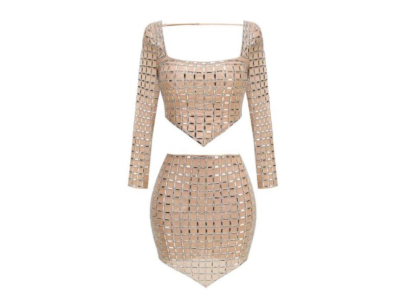 Εντυπωσιακό nude σετ δύο τεμαχίων με γεωμετρικά τετράγωνα κρύσταλλα που χαρίζουν λάμψη και πολυτελές αποτέλεσμα ιδανικό για glam εμφανίσεις