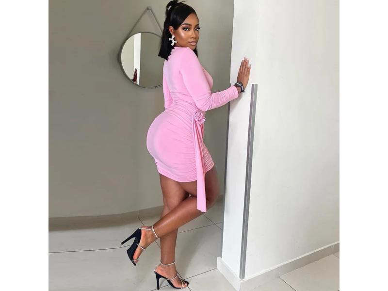 Mini φόρεμα με μακριά μανίκια και ιδιαίτερο δραπέ σχέδιο με δέσεις στο πλάι που αγκαλιάζουν τη σιλουέτα. Μοντέρνο και σέξι κομμάτι για βραδινές εξόδους και εμφανίσεις που ξεχωρίζουν.