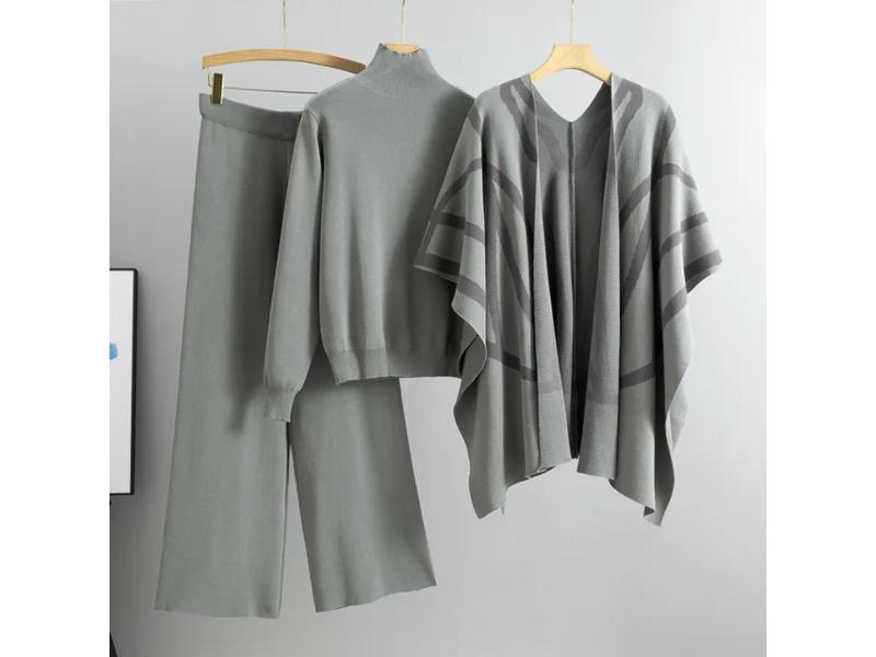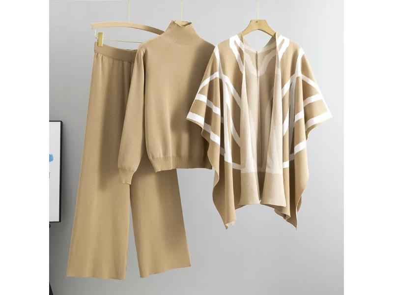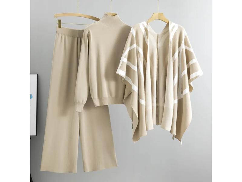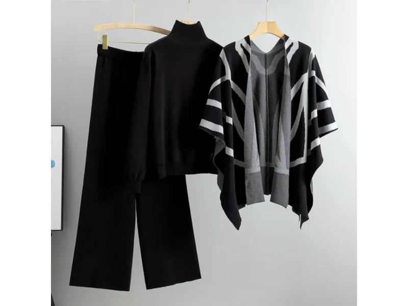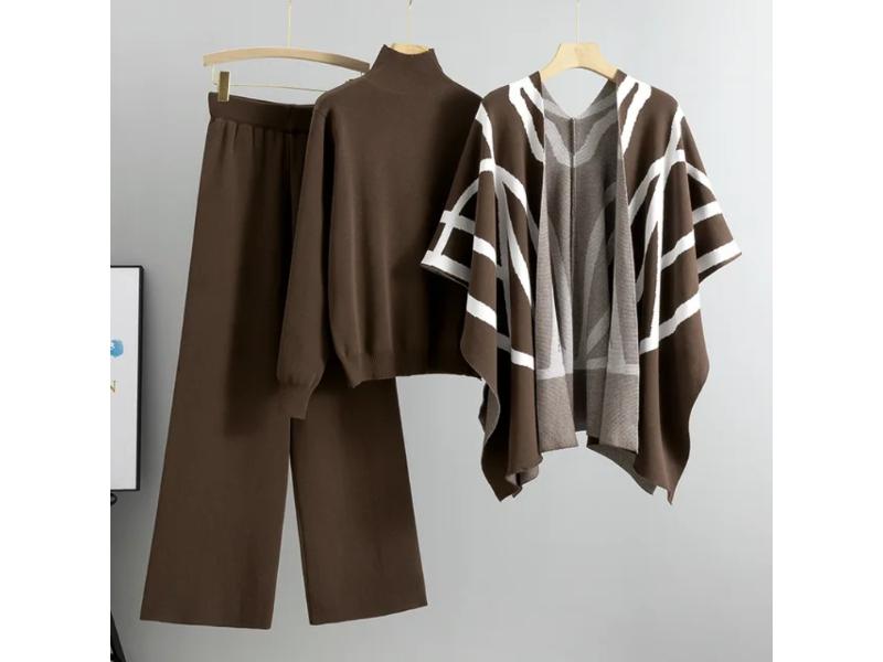 Πλεκτό σετ τριών τεμαχίων με ζιβάγκο παντελόνι και poncho με γεωμετρικό σχέδιο ιδανικό για κομψές χειμερινές εμφανίσεις με άνεση διαθέσιμο σε μπεζ καφέ γκρι εκρού και μαύρο