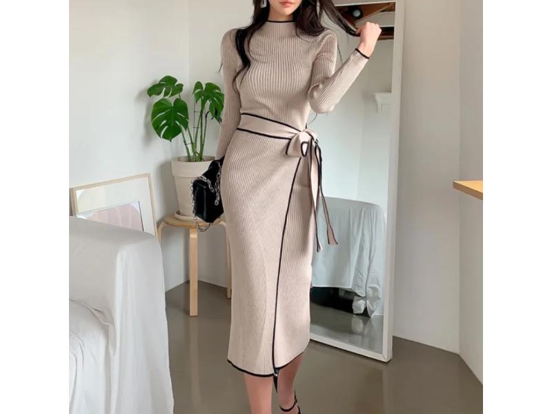 Πλεκτό φόρεμα midi με εφαρμοστή γραμμή μακρύ μανίκι και διακοσμητική ζώνη στη μέση που δένει στο πλάι με αντίθετες ραφές για minimal αλλά κομψό αποτέλεσμα διαθέσιμο σε μπεζ και μαύρο