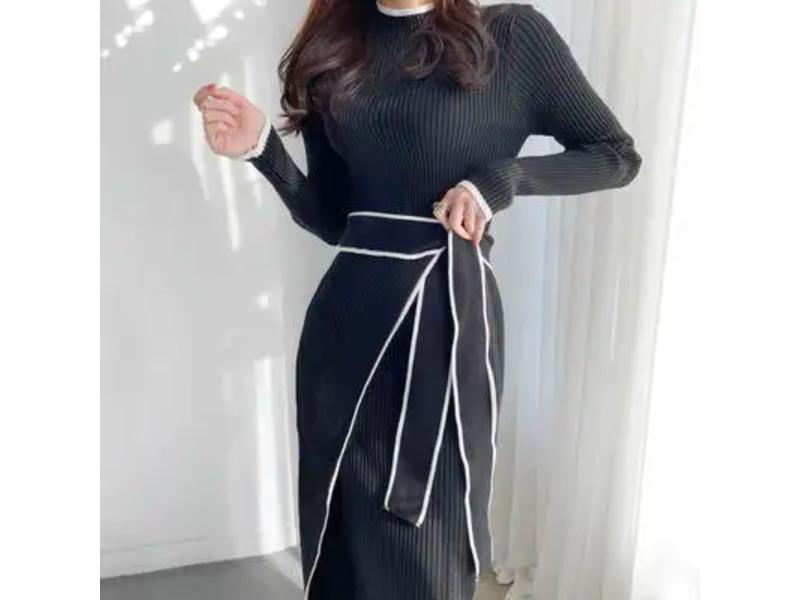 Πλεκτό Φόρεμα με Ζώνη και Αντίθετες Ραφές