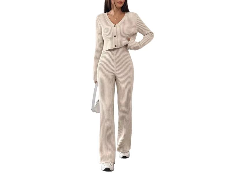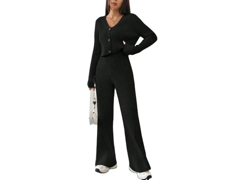 Άνετο και κομψό πλεκτό σετ με ribbed ύφανση που περιλαμβάνει cropped ζακέτα με κουμπιά και παντελόνι σε ίσια γραμμή ιδανικό για καθημερινές chic εμφανίσεις