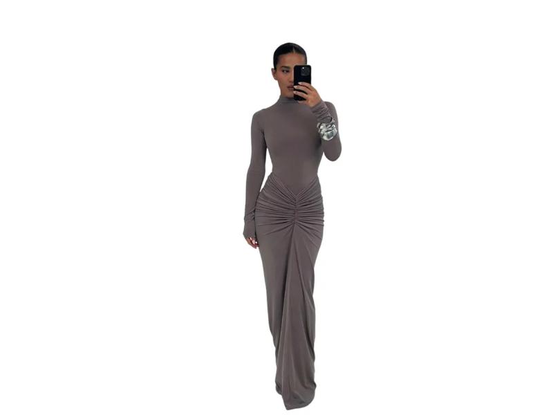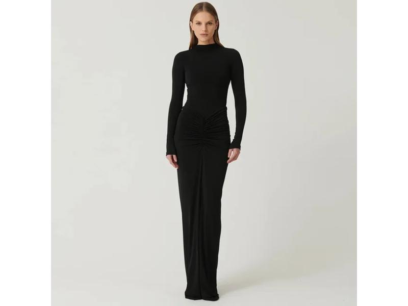 Μακρύ εφαρμοστό φόρεμα με μακρύ μανίκι και λεπτομέρεια ρουχαρίσματος στη μέση που αγκαλιάζει τη σιλουέτα. Κομψό και μίνιμαλ σχέδιο ιδανικό για βραδινές εμφανίσεις.