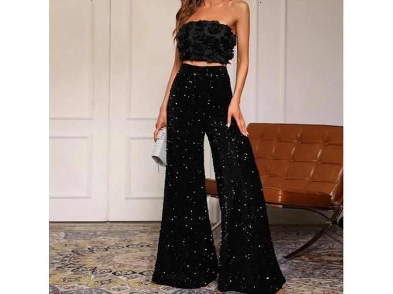 Λαμπερό σετ με στράπλες τοπ διακοσμημένο με 3D λουλούδια και ψηλόμεσο παντελόνι καλυμμένο με παγιέτες ιδανικό για glamorous εμφανίσεις που τραβούν τα βλέμματα
