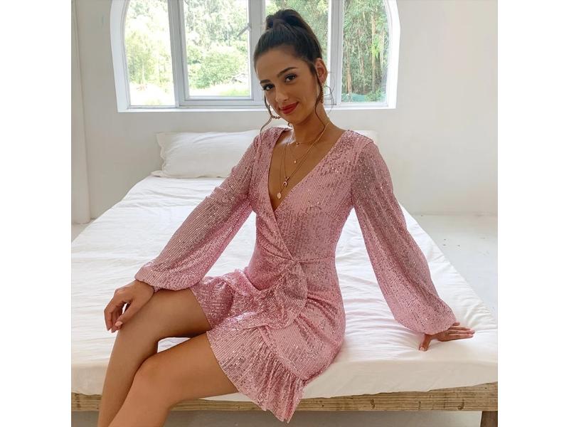 Mini φόρεμα wrap με glitter υφή μακριά μανίκια εφαρμοστή γραμμή και βολάν τελείωμα που αναδεικνύει τη σιλουέτα ιδανικό για βραδινές εξόδους party και festive εμφανίσεις