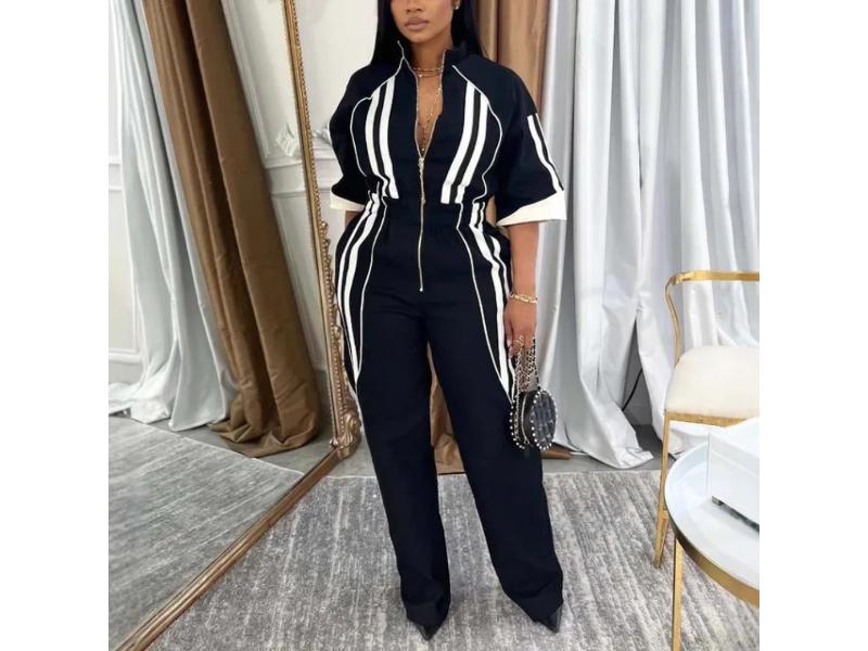 Κομψή ολόσωμη φόρμα με κάθετες ρίγες που αναδεικνύουν τη σιλουέτα και φερμουάρ μπροστά για μοντέρνο και δυναμικό look ιδανική για εμφανίσεις με αυτοπεποίθηση από μέρα σε βράδυ