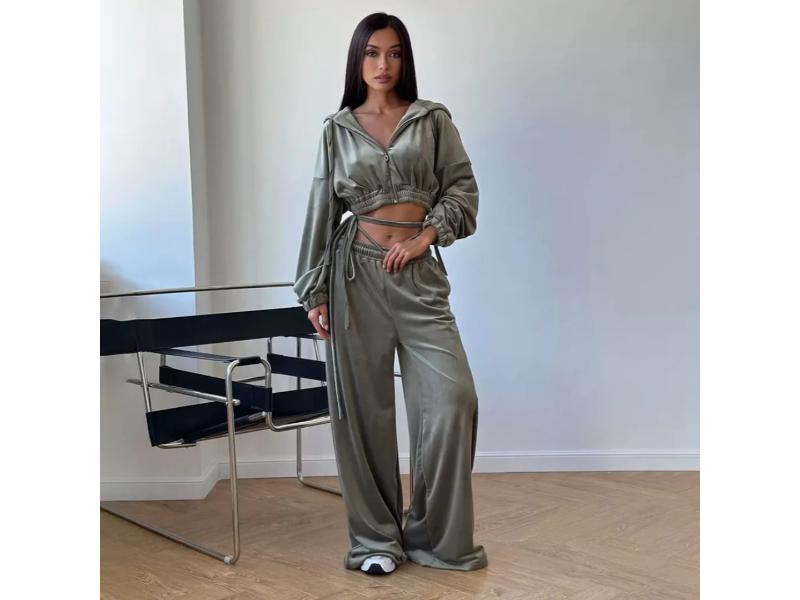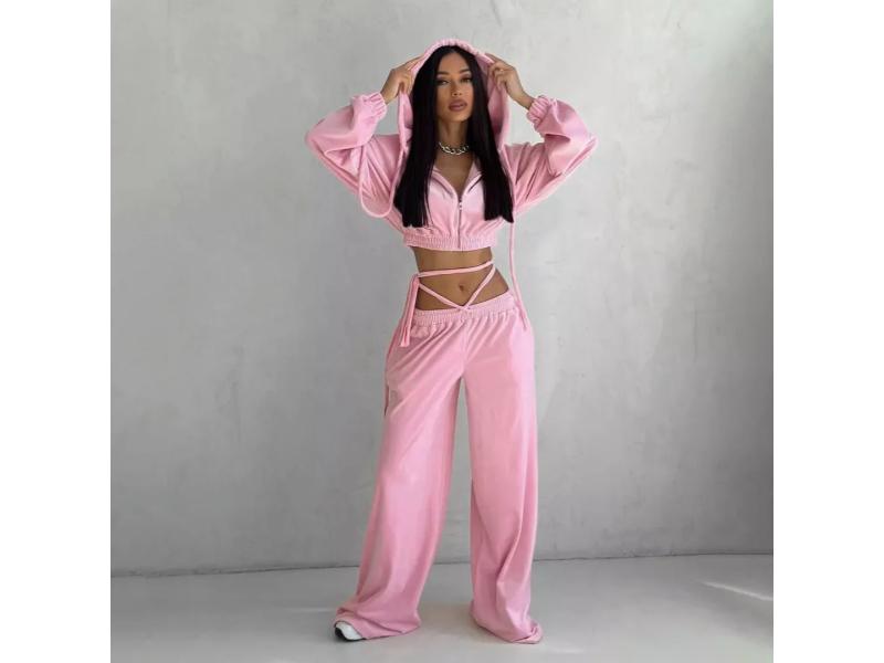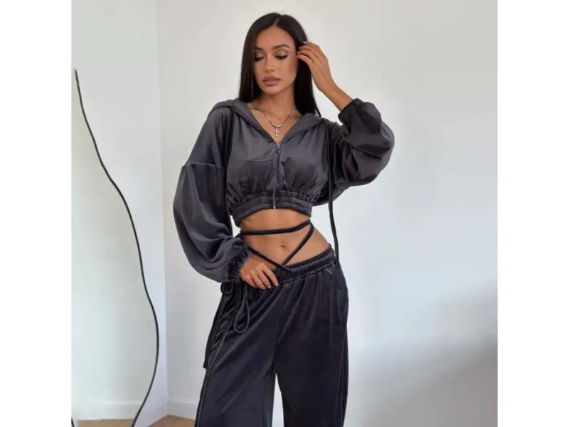 Σετ velvet με cropped φούτερ και φαρδύ παντελόνι Διαθέτει κουκούλα και λεπτομέρειες δεσίματος στη μέση για μοντέρνο και άνετο look